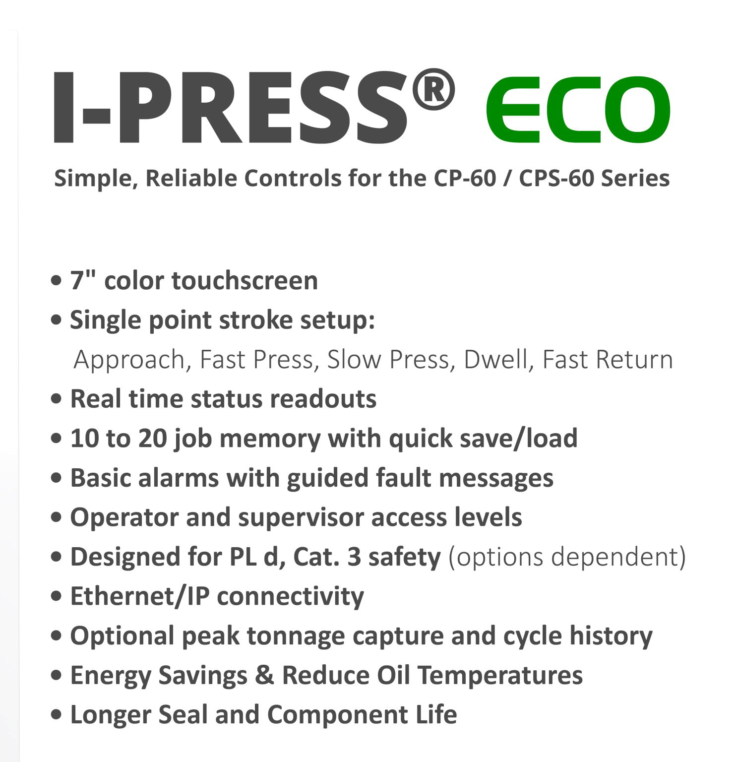 At the core, I-PRESS® ECO Controls unify programming, storage, and recall of jobs—reducing variability in environments with frequent changeovers. The result: predictable throughput and a smoother path from first-article approval to sustained production.
